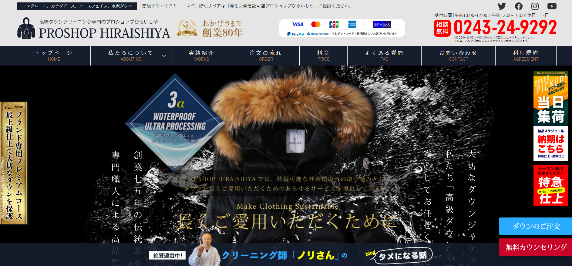 「PROSHOP_HIRAISHIYA(プロショップ平石屋)」は、創業80年以上の歴史を持つ、国内屈指の高級ダウンクリーニング専門店です。昭和17年創業以来、丁寧な手仕事と高度な技術で全国の顧客から信頼を集め、現在では高級ダウンクリーニング受注数・全国1位を誇ります。