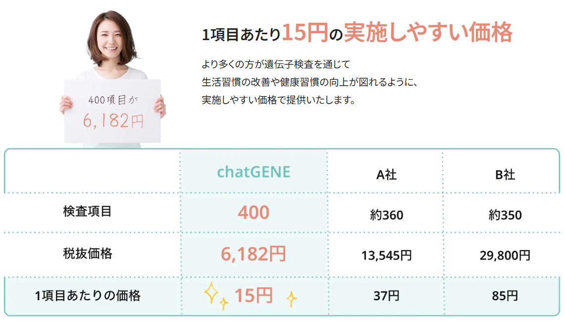 遺伝子検査に興味はあるけれど「価格が高くて踏み切れない」と感じている方へ。chatGENE(チャットジーン)は、6,800円という手に取りやすい価格設定と、充実の400検査項目で従来の遺伝子検査と差別化されたサービスです。健康・ダイエット・肌・睡眠・性格など、日常に直結する情報を知ることで、無駄の少ないセルフケアや生活設計に役立てられます。
