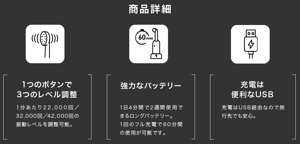 ブラックを基調としたクールな外観は男女問わず持ちやすく、洗面所やデスク周りになじみます。USB充電対応でモバイルバッテリーやPCからも充電でき、トラベルケースを使えば出張先でもスマートにケアできます。
