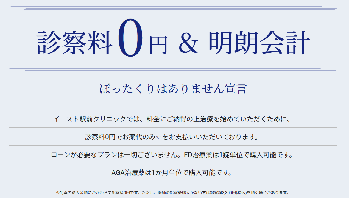 イースト駅前クリニックの大きな特徴は、予約不要で院内処方が受けられる点や、土日祝日も診察を行っている点です。スタッフは男性で統一されており、周囲の目が気になりにくい環境が整っています。診察料が無料であるため、来院ごとに余計な費用を心配する必要がなく、治療は処方される薬代のみで受けられる点も魅力です。