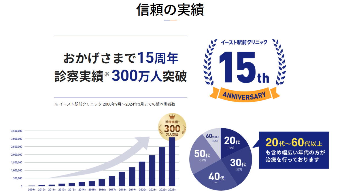 イースト駅前クリニックは、ED治療とAGA治療を専門に診療する男性向けクリニックです。2008年の開院以来、全国に40院以上を展開し、累計200万人以上の診療実績を持つため、初めて相談する方でも受けやすい体制が整っています。駅から徒歩1分の立地や、初診・再診料が無料で薬代のみの明瞭な料金体系など、「通いやすさ」と「続けやすさ」を重視する方に向いているクリニックです。